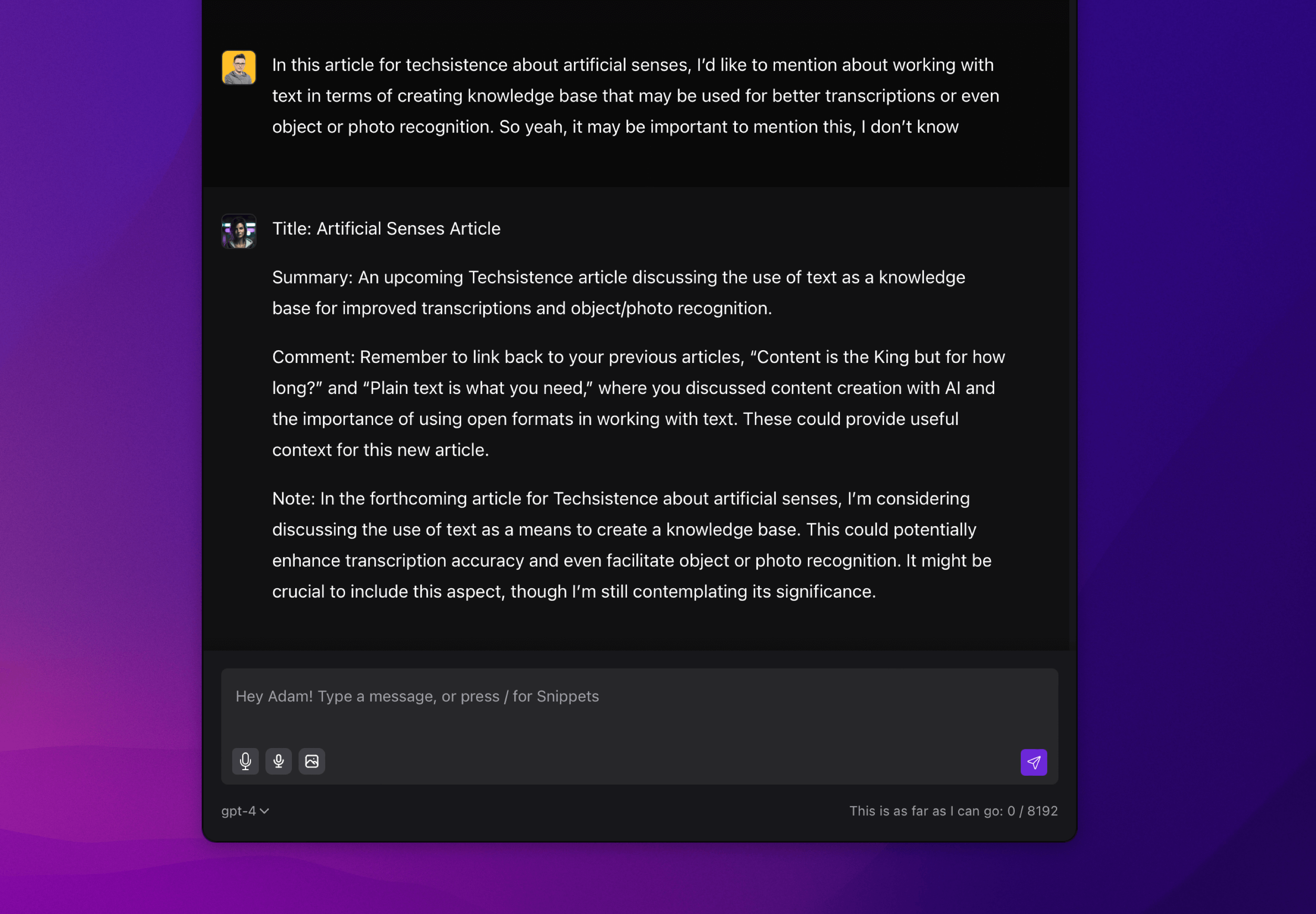 In my daily interaction with LLM, I use my own version of Alice, which has access to long-term memory, making the responses personalized. Questions about programming by default consider the use of the latest version of ECMAScript, and the issued commands perform actions in the applications I use or, thanks to AppleScript, interact directly with my computer. Alice also has information about my experience (e.g., the fact that I am just learning Rust), which she includes in her statements without the need to remind her each time.