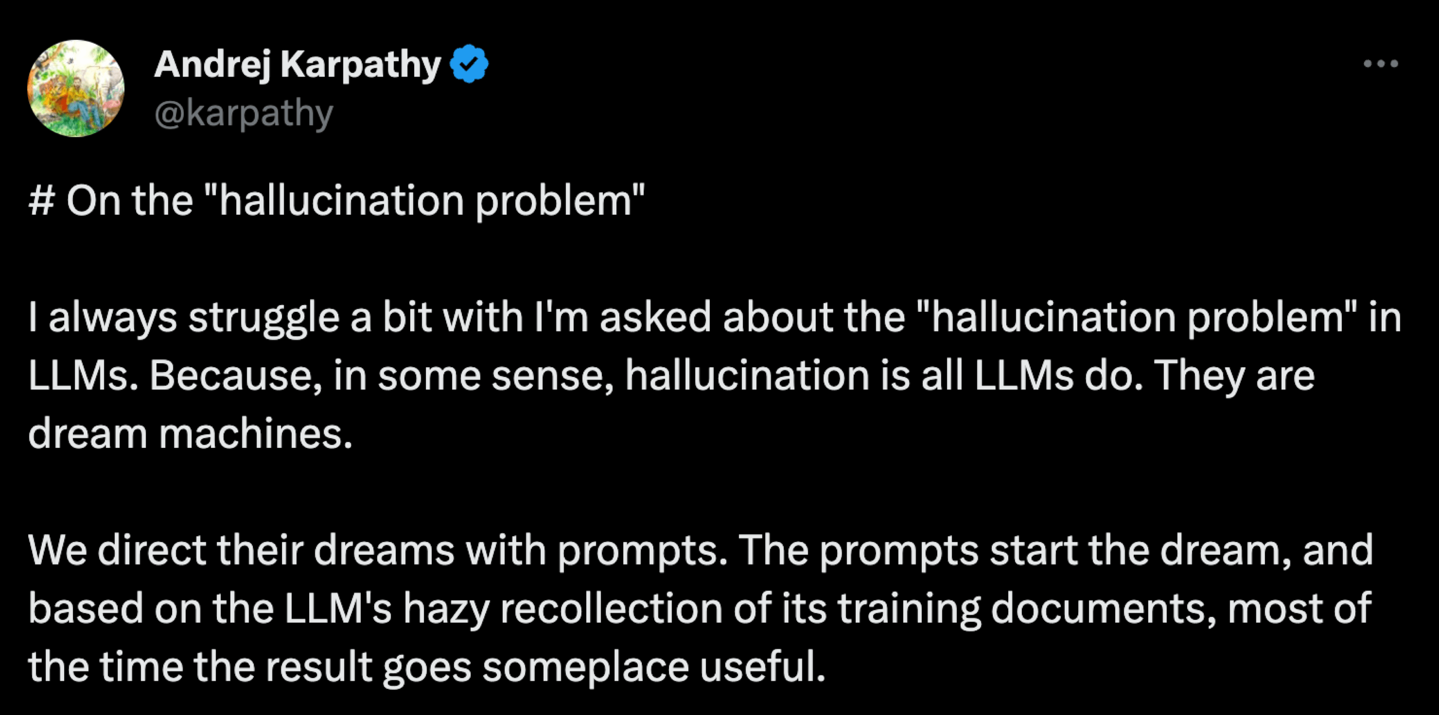 Of course, this does not exclude the presence of mistakes and misinterpretation, which bring to mind the phenomenon referred to as \"model hallucination.\" A different light is shed on this by a tweet from Andrej Karpathy noting that LLMs are dream machines, and hallucination is in a sense the only thing they can do. Our task is to direct this dream in such a way as to achieve results as close as possible to those we expect.