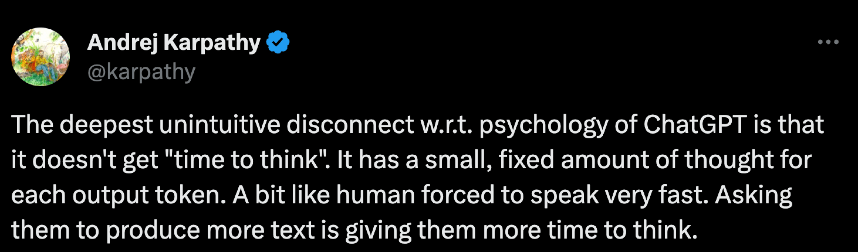 Speaking of "understanding" in the performance of LLMs, we should also pay attention to the very way of "thinking" associated with generating subsequent tokens. Here again, Andrej in one of his posts points out the "thinking time" which in the case of the model is very short and takes place during the generation of the next token. Therefore, by asking for a longer statement from the model, we give it additional time to think, which positively affects the quality of the generated response. For example, we can ask for "step-by-step thinking" or "step-by-step verification."