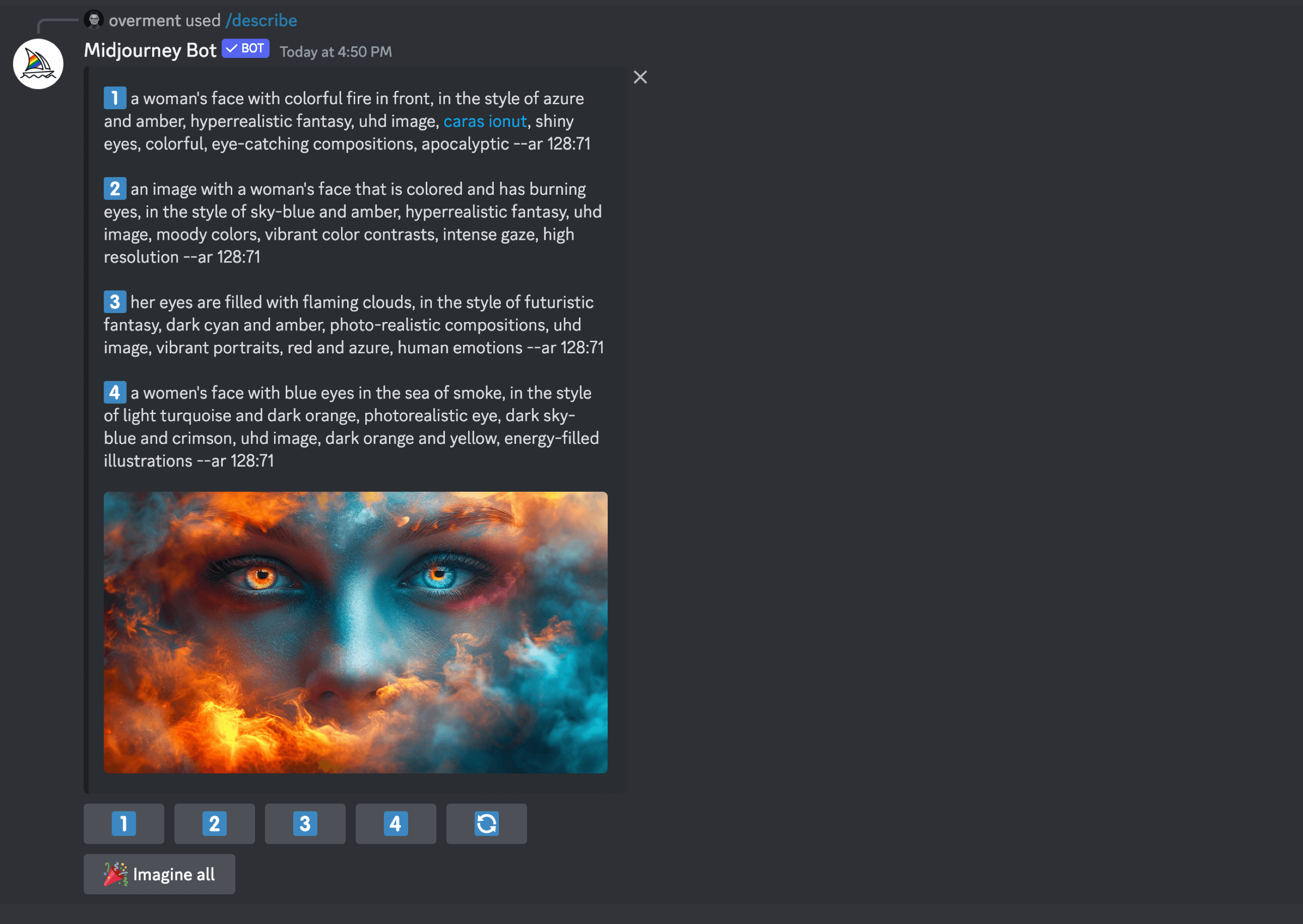 Describing the features of an image can also be helpful in generating new creations, making modifications, or creating variants. Below you can see how Midjourney described the photo I sent in various ways. Here I can use these results directly or make modifications to them, which can also be done with the help of an LLM.