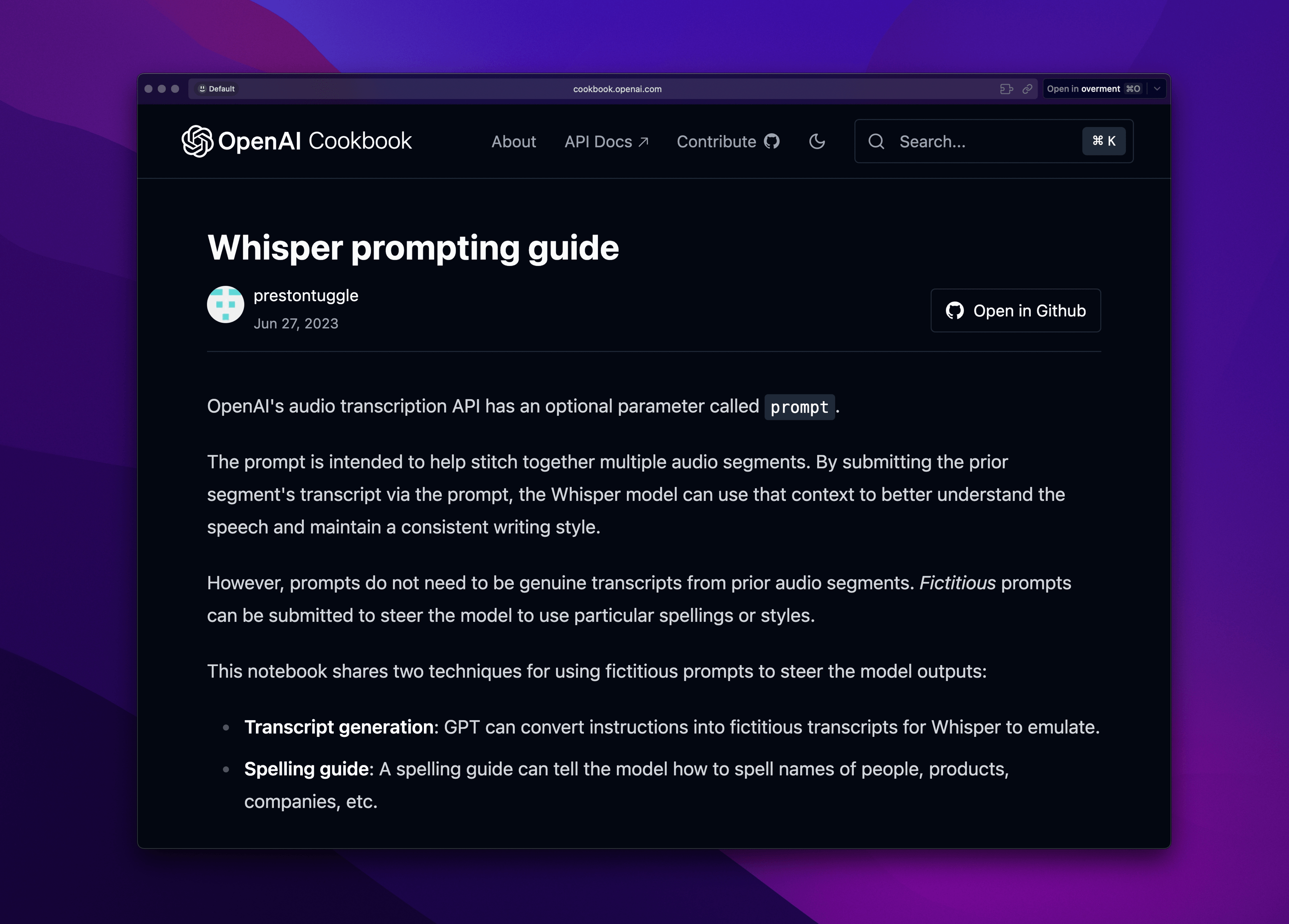 Working with the Whisper model, the basic configuration includes defining a prompt that is considered when generating transcriptions. The prompt affects the way individual words are written or the overall style. Suggestions for prompts can be found in the OpenAI Cookbook.