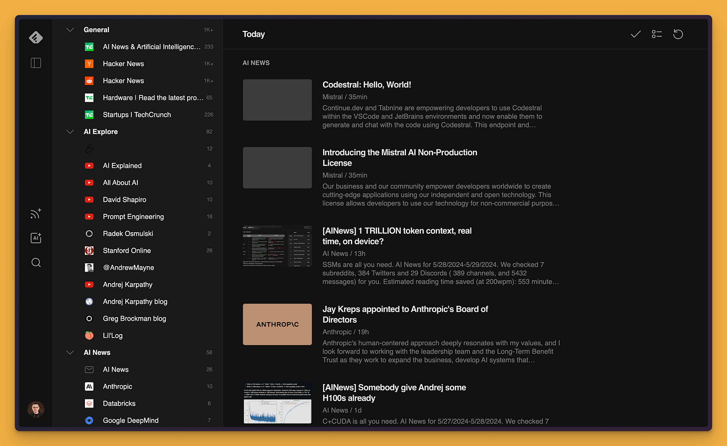 Staying up-to-date and monitoring news on topics that interest me is handled through Feedly. Like with previous tools, the main factor influencing my choice here is the availability of an API.