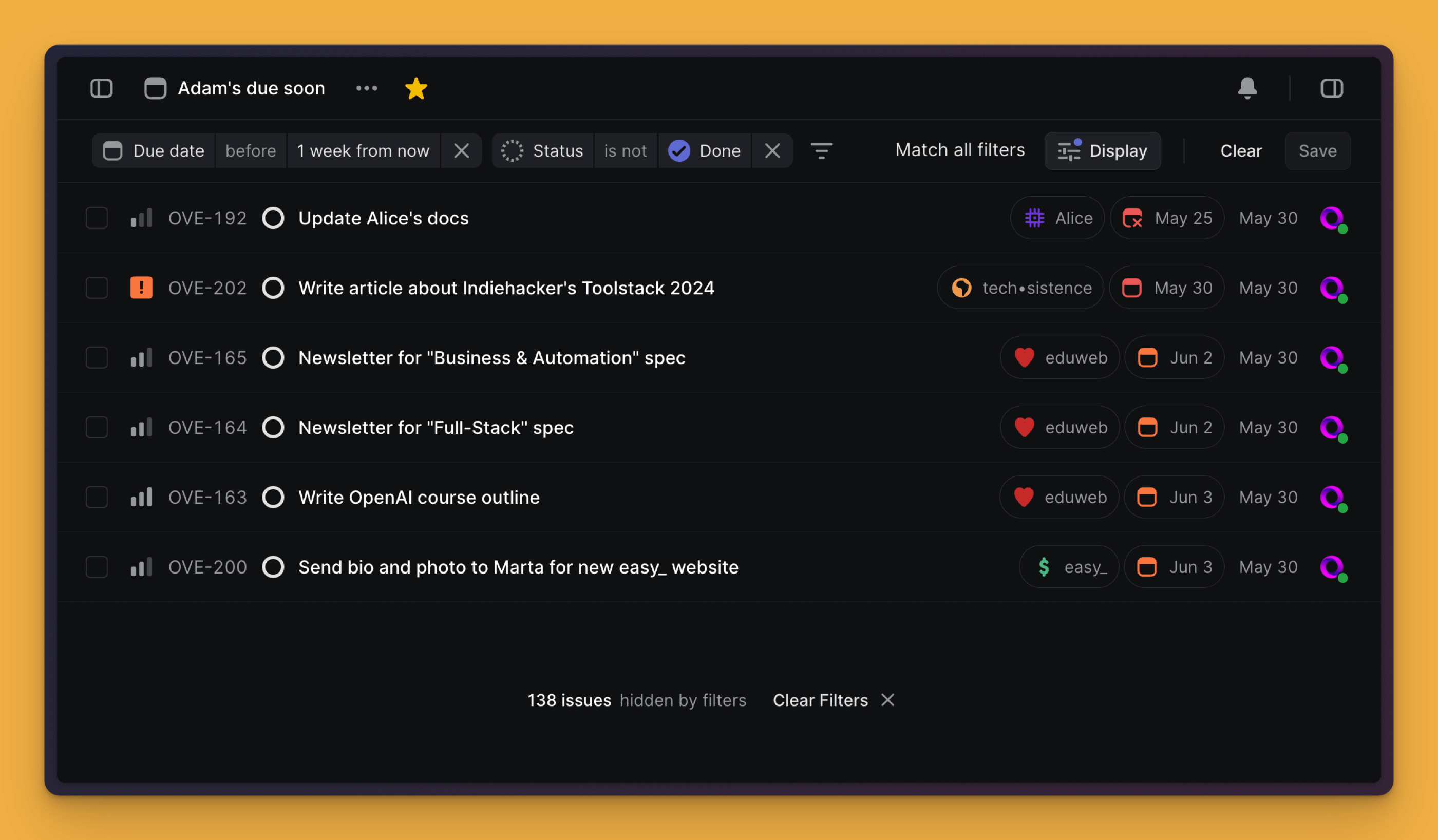Of all the task management tools, I've liked Todoist and Linear the most so far. Both offer APIs that allow nearly unrestricted data management. Besides the API, a clear GUI and keyboard shortcuts are crucial to me, and Linear definitely outperformed in this area. As seen in the screenshot above, you can customize views to suit your specific needs or current situation.