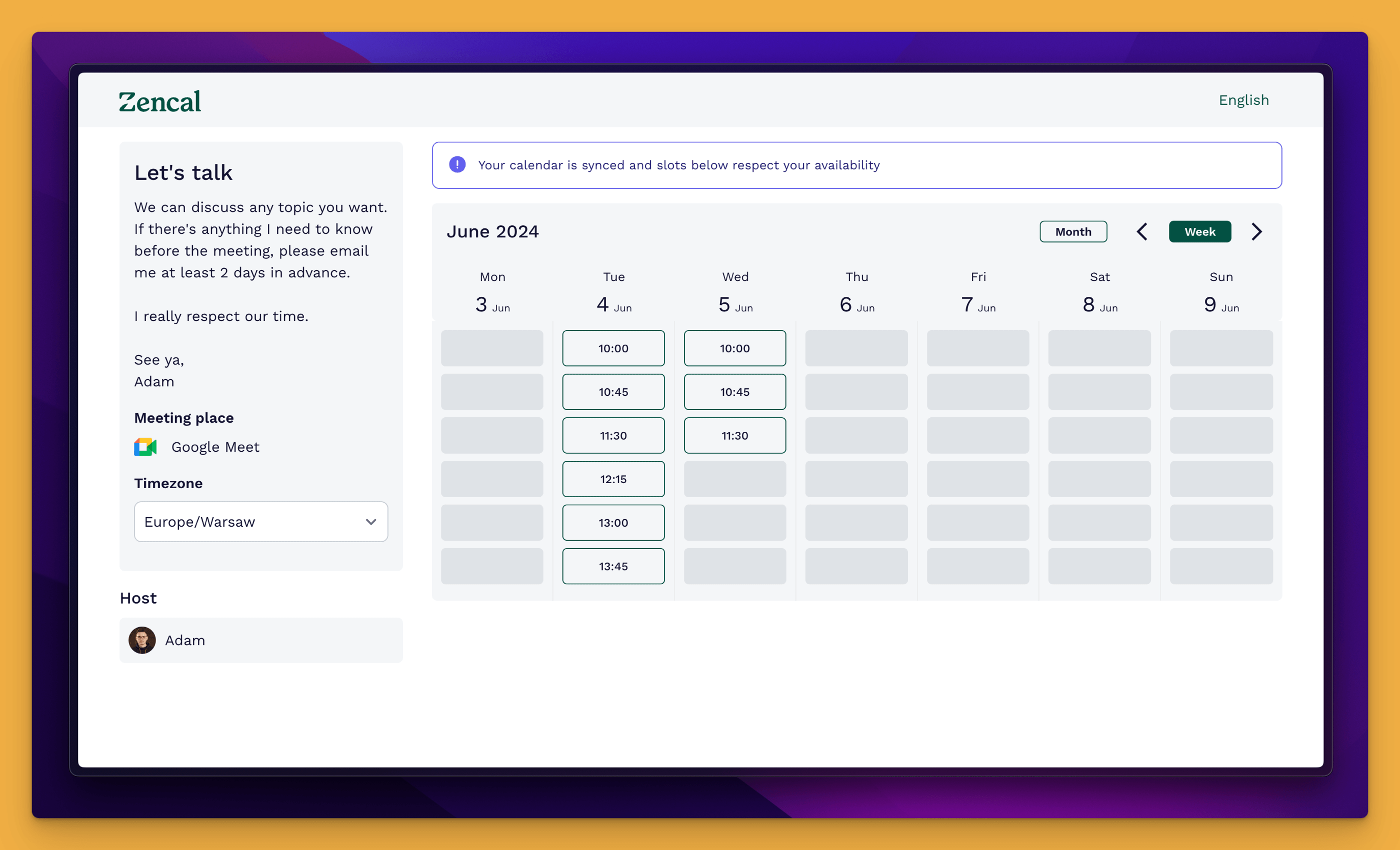 You can book a slot in my calendar through Zencal. These pre-set time blocks automatically disappear when a meeting is scheduled or another entry, like a trip, appears in my calendar.
