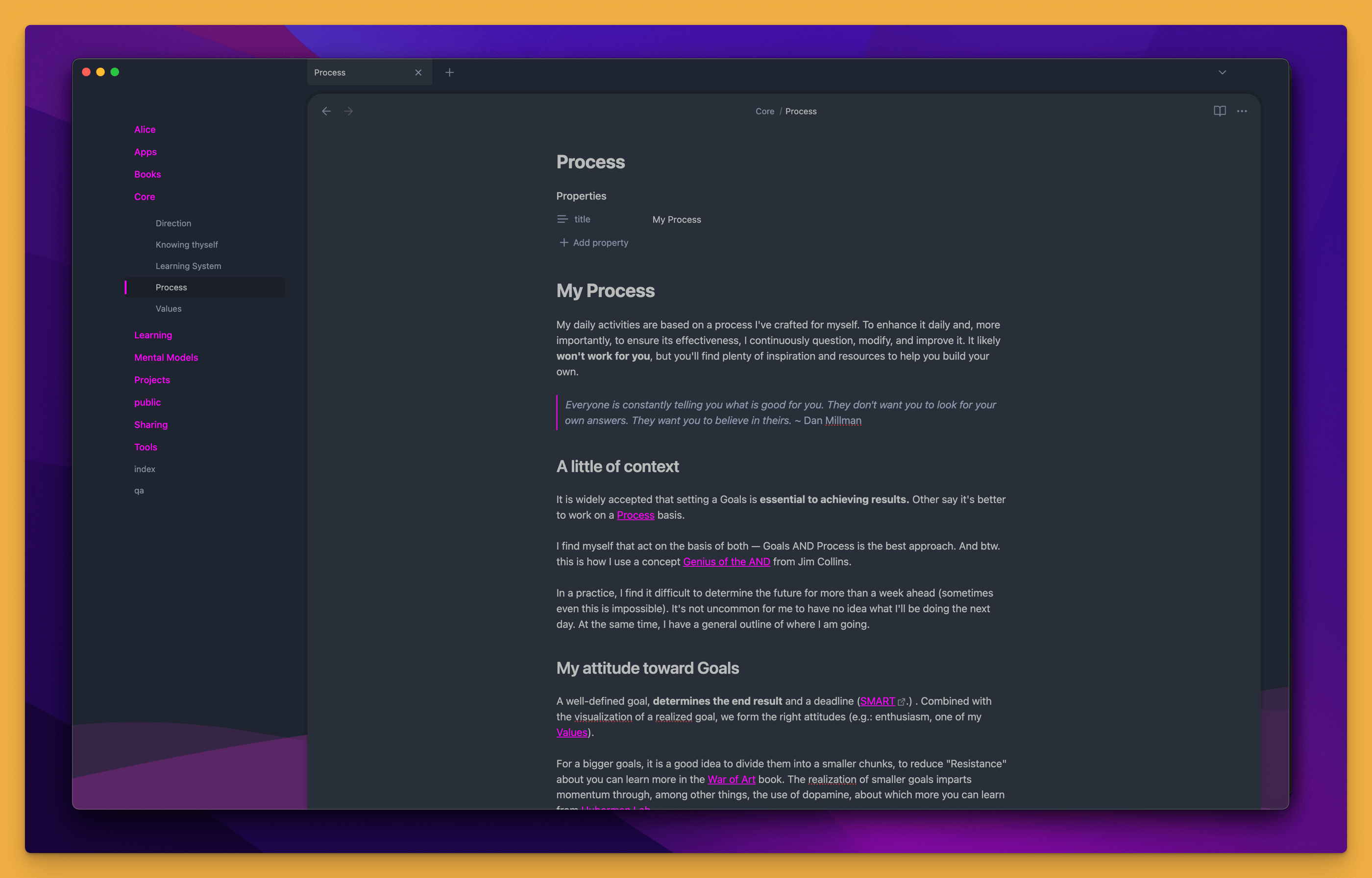 Obsidian: An app I rarely write in and usually just paste content from iA Writer or Paper. But it’s great for organizing content. Paired with Vitepress, I can share most of my notes online as a static website.