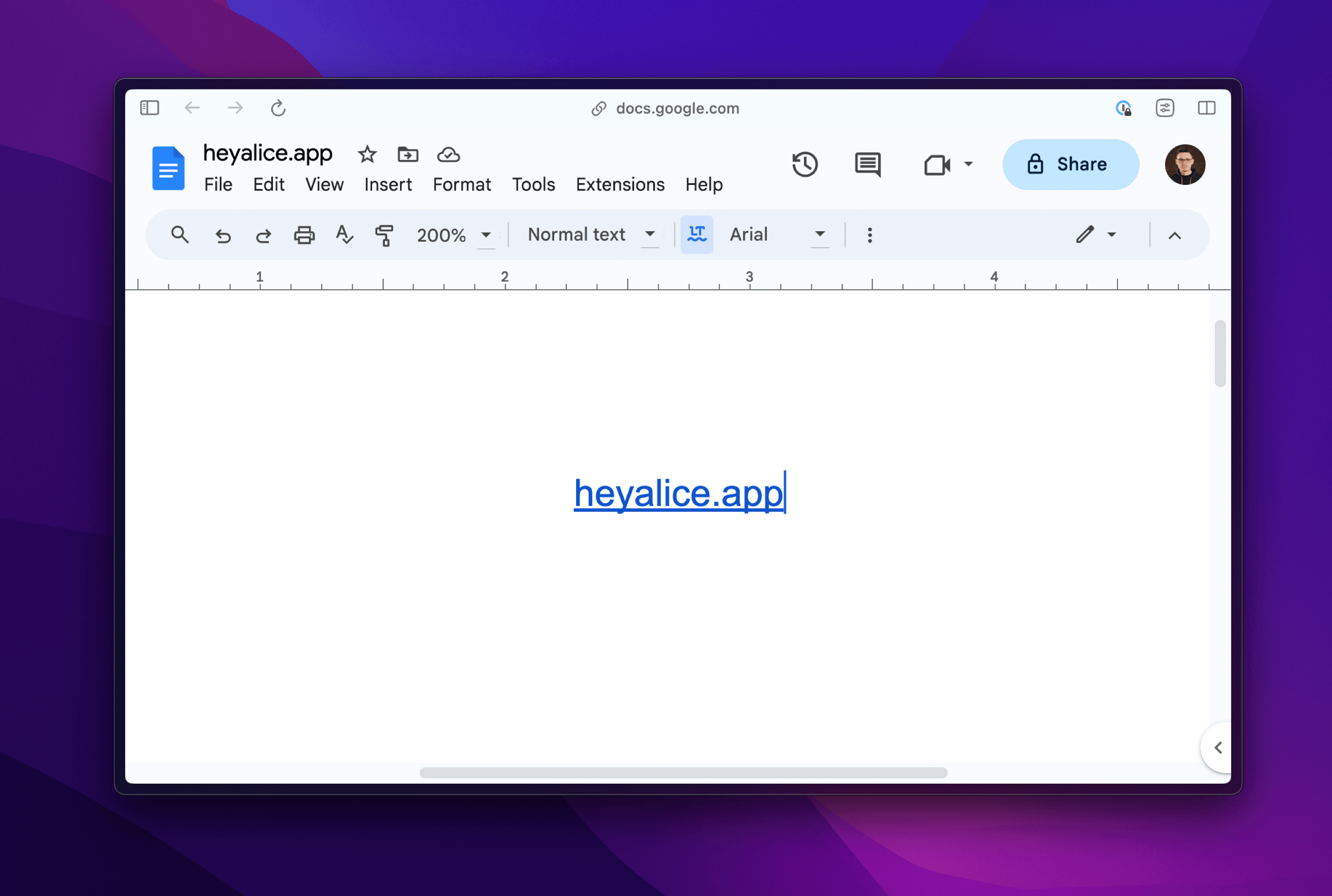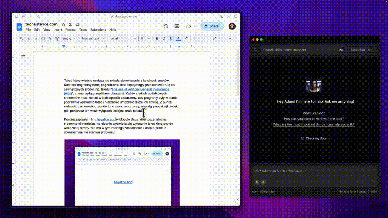 Below, I've included the link heyalice.app in Google Docs, so apart from a few interface elements, the screen only displays text directing to the indicated page. The document is straightforward and can be easily worked on further.