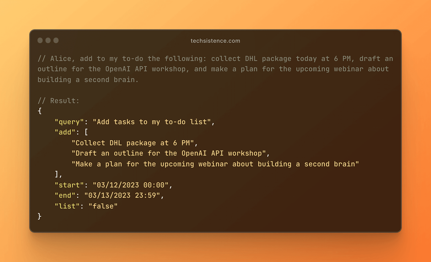 This process is much more complex than just a simple correction or text translation. One of its stages included generating a structure that describes the content of the sent message. It took into account individual tasks and additional settings that are significant from the perspective of the logic responsible for actually adding tasks to my list.