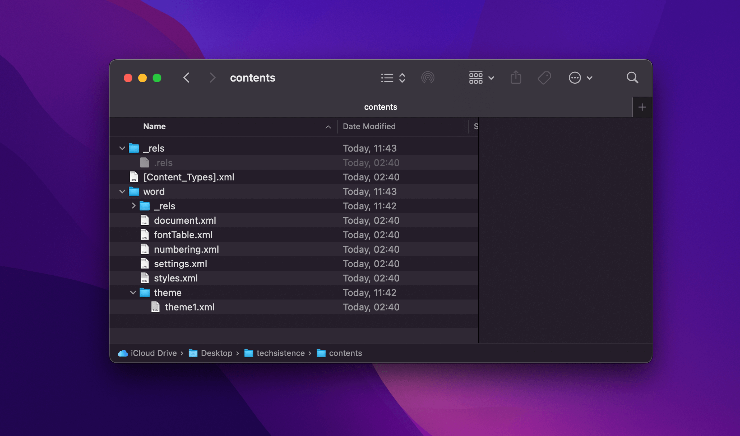 When you delve deeper, things get a bit trickier. If you save a file as a .docx, then rename it to .zip and unzip it, you'll discover that the document is made up of several .xml files. This reveals a rather intricate setup, made even more complex by the detailed content within the files. As a result, making any changes isn't straightforward, which is why using an interface of applications like Google Docs or Microsoft Word is almost a necessity.