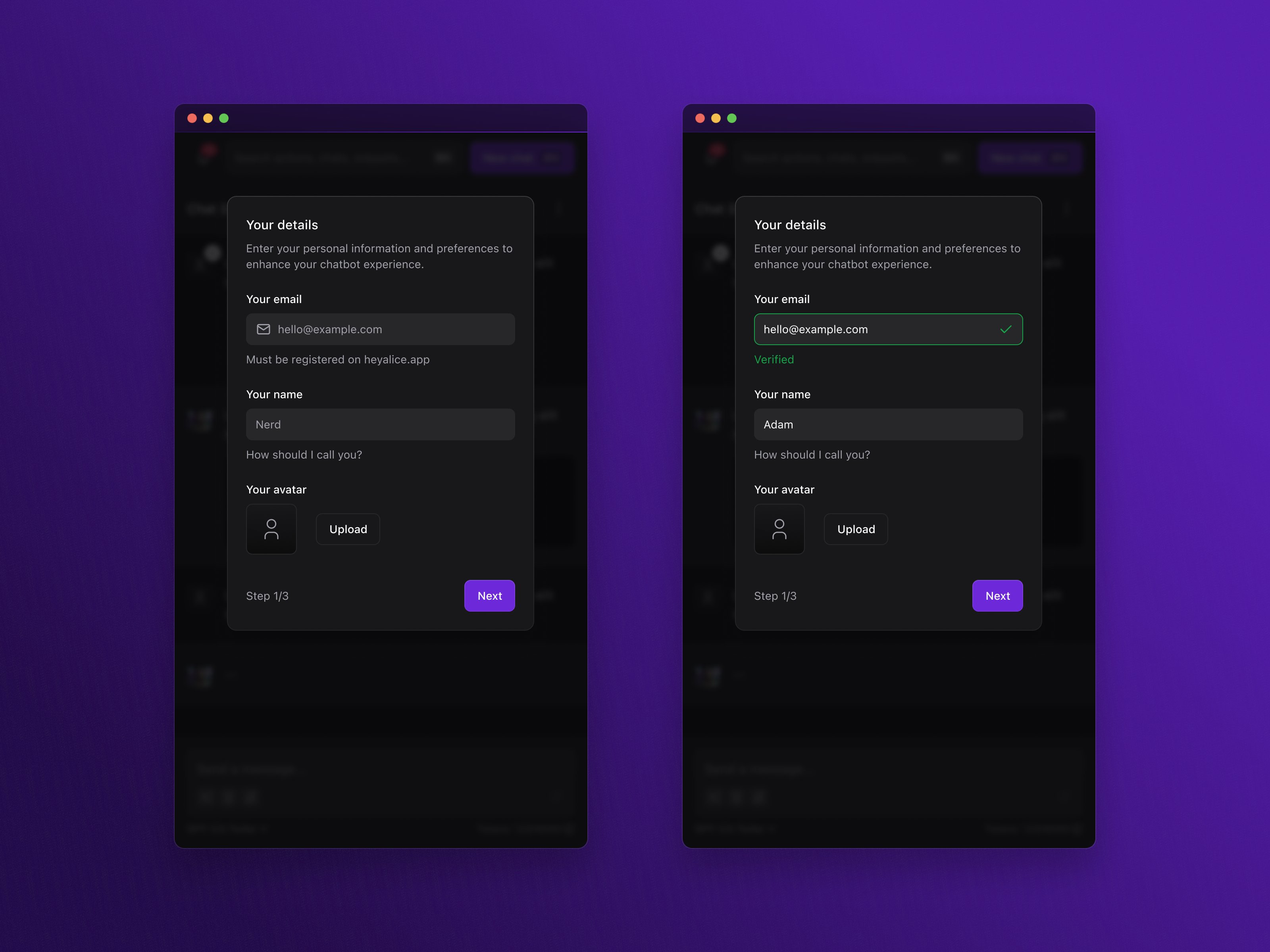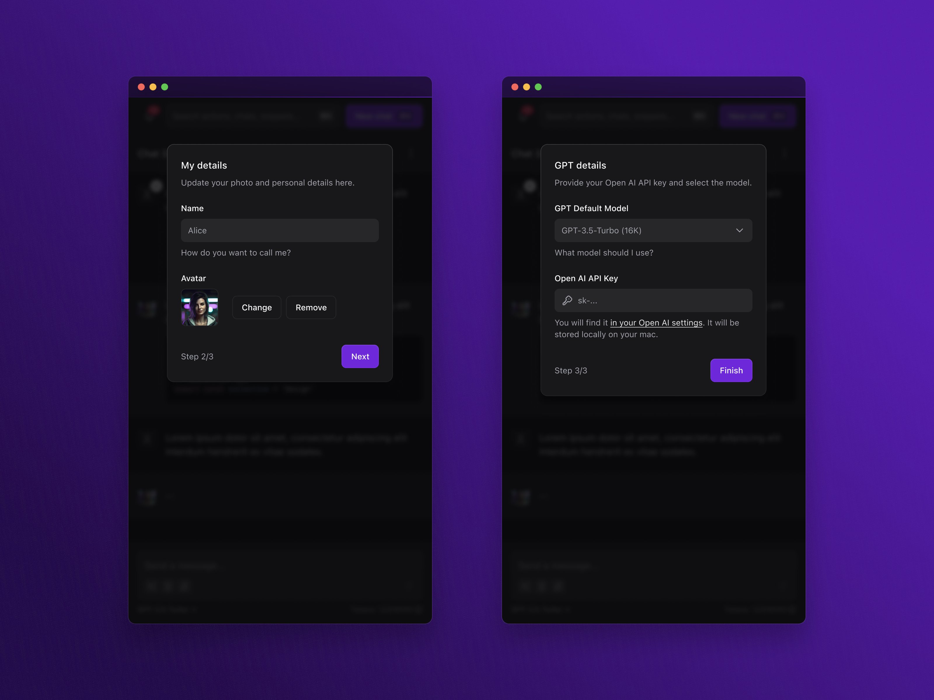 When launching Alice, we designed a simple onboarding that allows for customizing the application and entering the OpenAI API key.