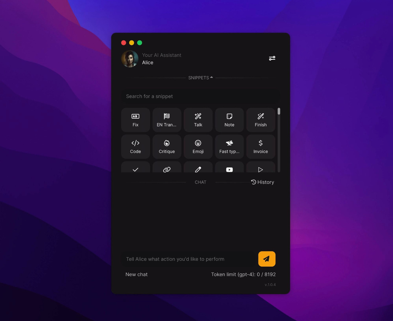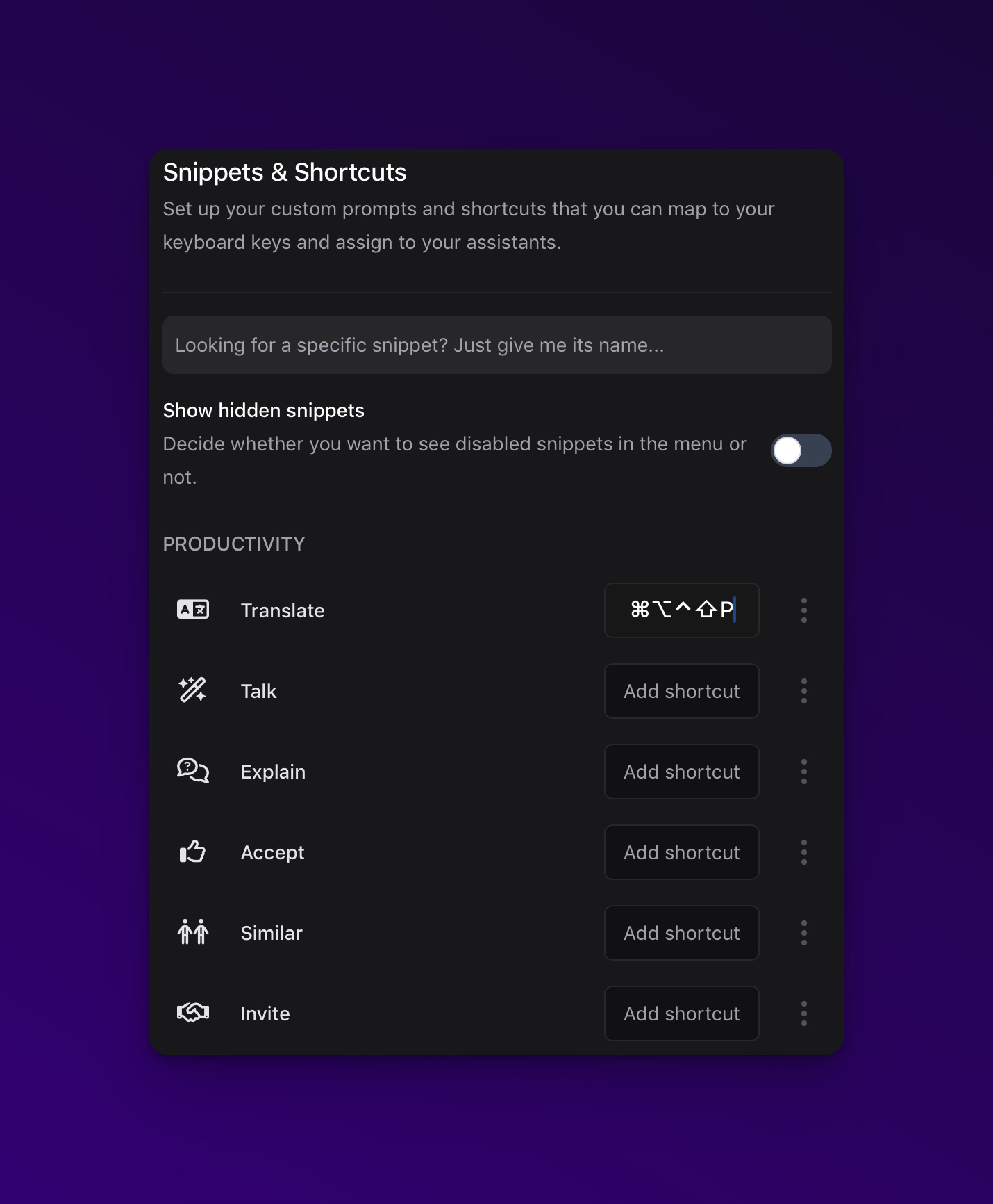 That's why in Alice, keyboard shortcuts primarily allow you to call up the application at any time, but also run any Snippet (prompt) on selected text. We designed a convenient interface for defining Snippets and their shortcuts: