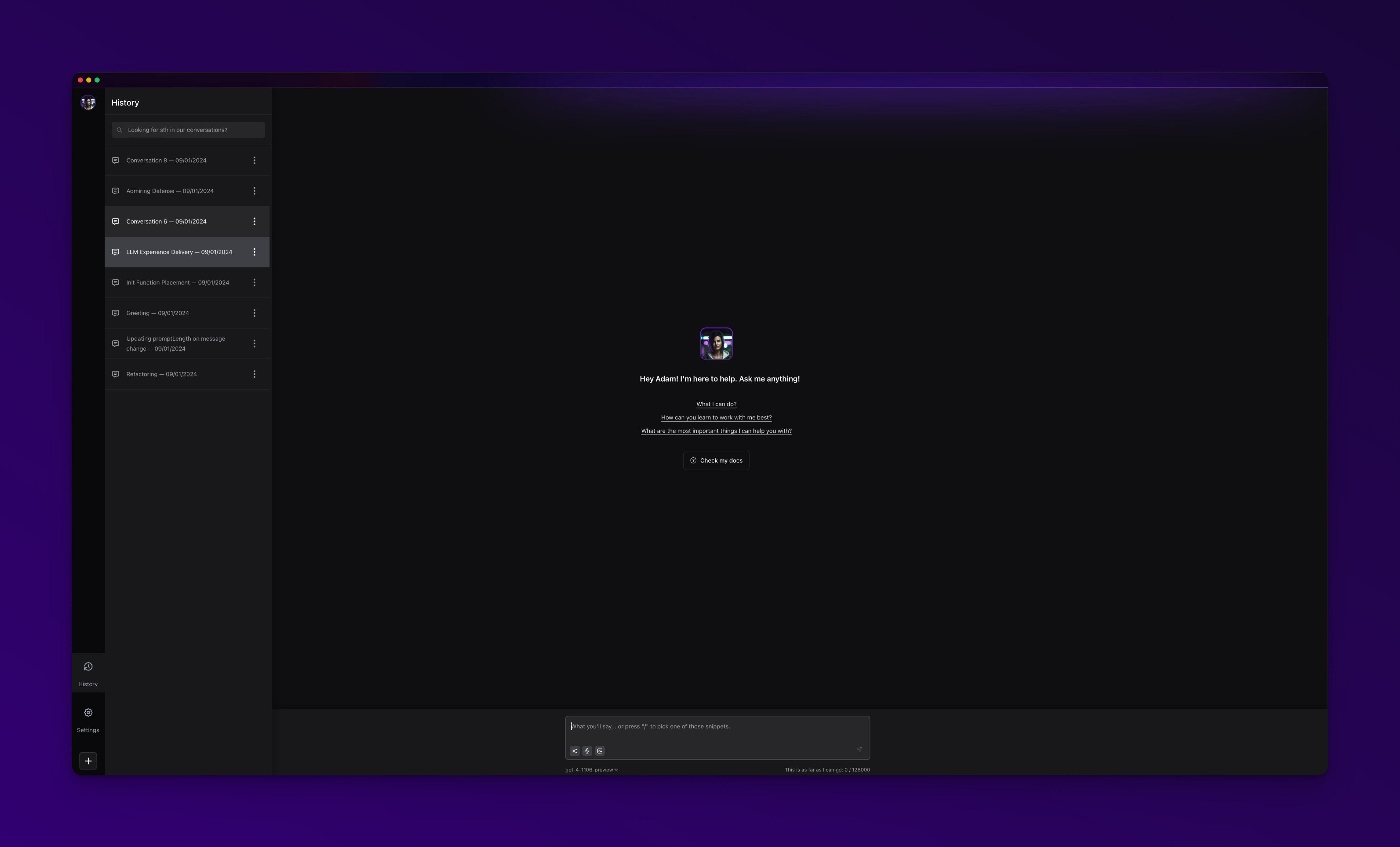 The entire interface was designed to be as compact as possible and encourage the user to use keyboard shortcuts. In this way, after just a few days of using Alice, it's simply hard to imagine working without it. However, we also prepared a view that allows for full-screen work, focusing on a specific conversation. This mode is similar to the ChatGPT interface and is useful when we want to work with the application itself for a longer time: