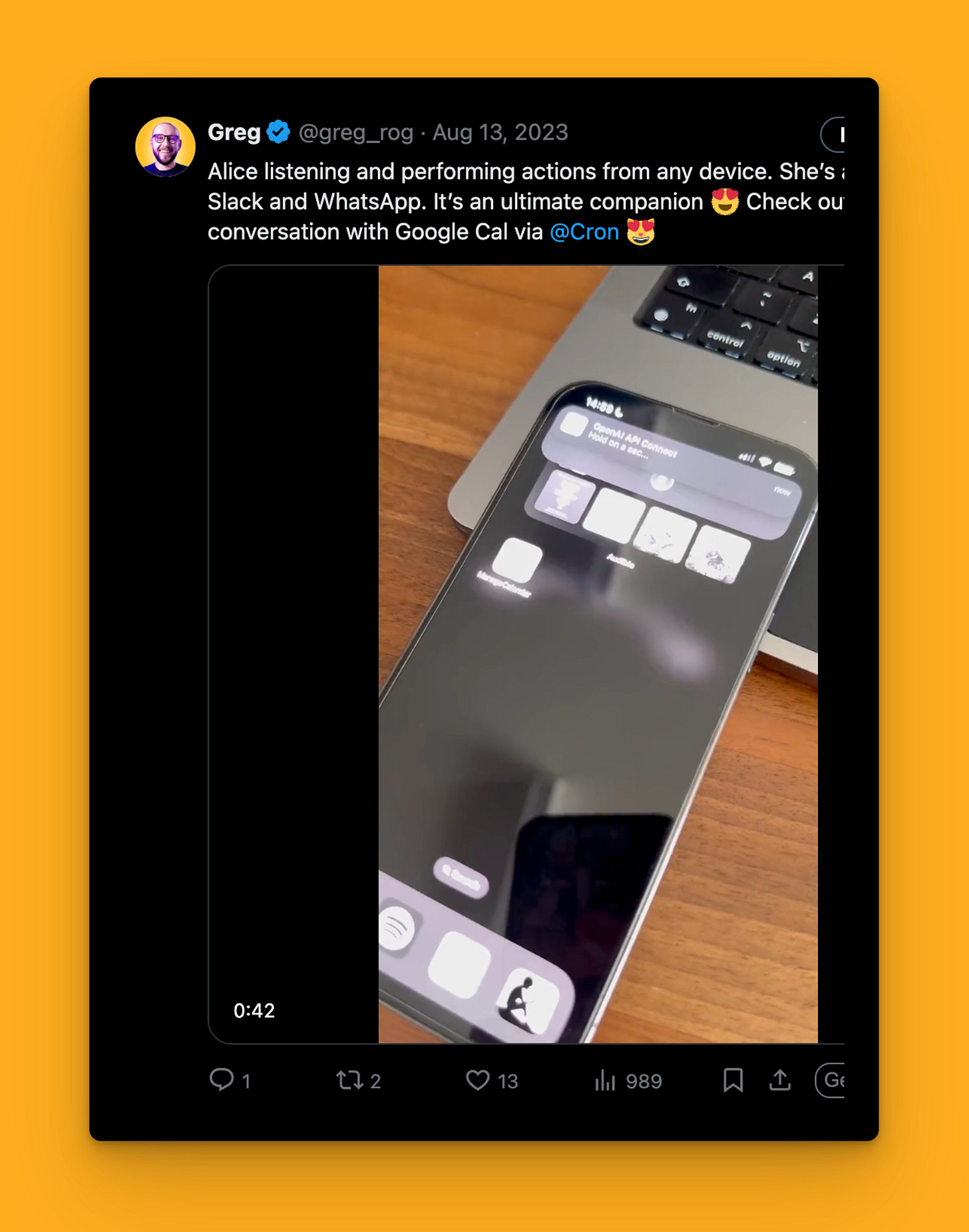 Along the way, we experiment with Alice's applications. When we explain Alice to people, it's hard for them to grasp concrete uses. In essence, you can do almost anything, but as we know, this isn't a tangible example. That's why we created a series of small examples of how Alice communicates with the applications we use, which I published on X.