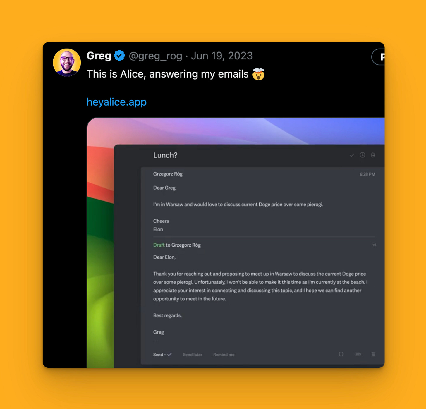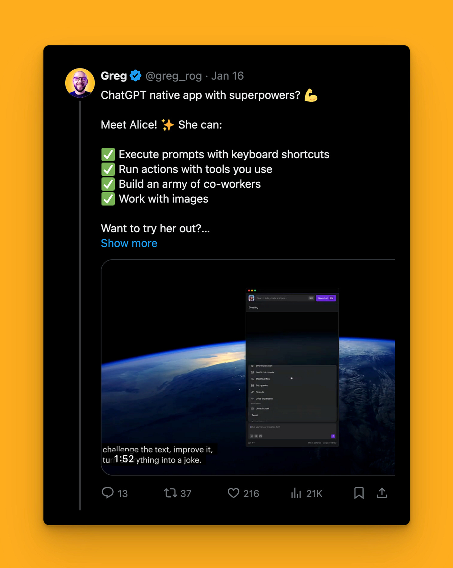 We're practically ready to make Alice available to a larger group of people, but the question is, are these people ready? We realize that Alice is not just a fast native interface for LLM and we don't want to advertise it that way. On the other hand, getting more out of it, like action handling, requires a basic understanding of automation techniques and, in general, our approach to productivity. It turns out that these early users who actually use Alice almost daily are people who have spent more time with us - participated in one of our programs or read our e-books.