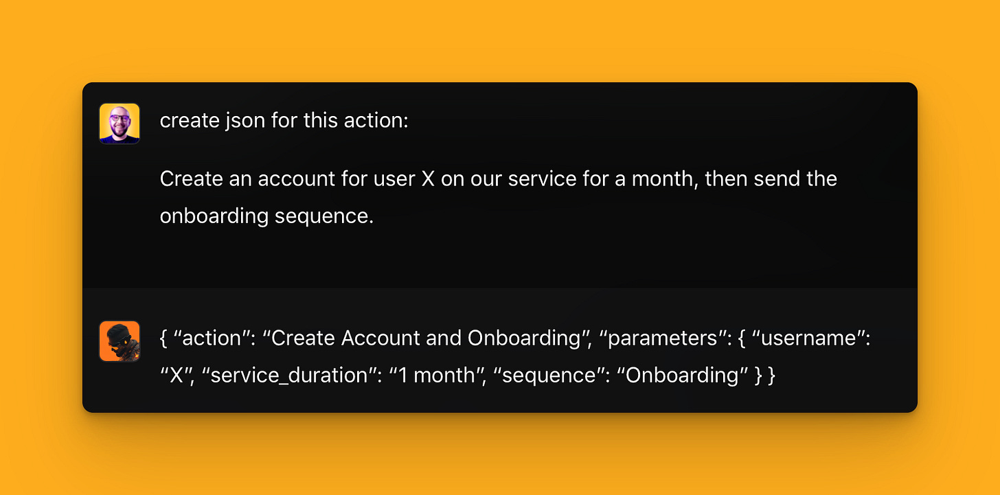 Aha moment! One simple thing that lifts the spell and allows me to demystify AI in terms of productivity. It turns out that LLM is quite good at transforming the commands it gets from me into the JSON format I use in all my automations. This is now common knowledge, used by many tools, but around the early days of ChatGPT, it wasn't yet obvious to practically anyone. This one simple thing (again, something that seems like fun) is the missing puzzle piece to connect AI with productivity. It allows me to run my automations in a completely new way - by having a conversation with the model. In this way, I can easily imagine a scenario where I or a person from my team gives a command to the AI: